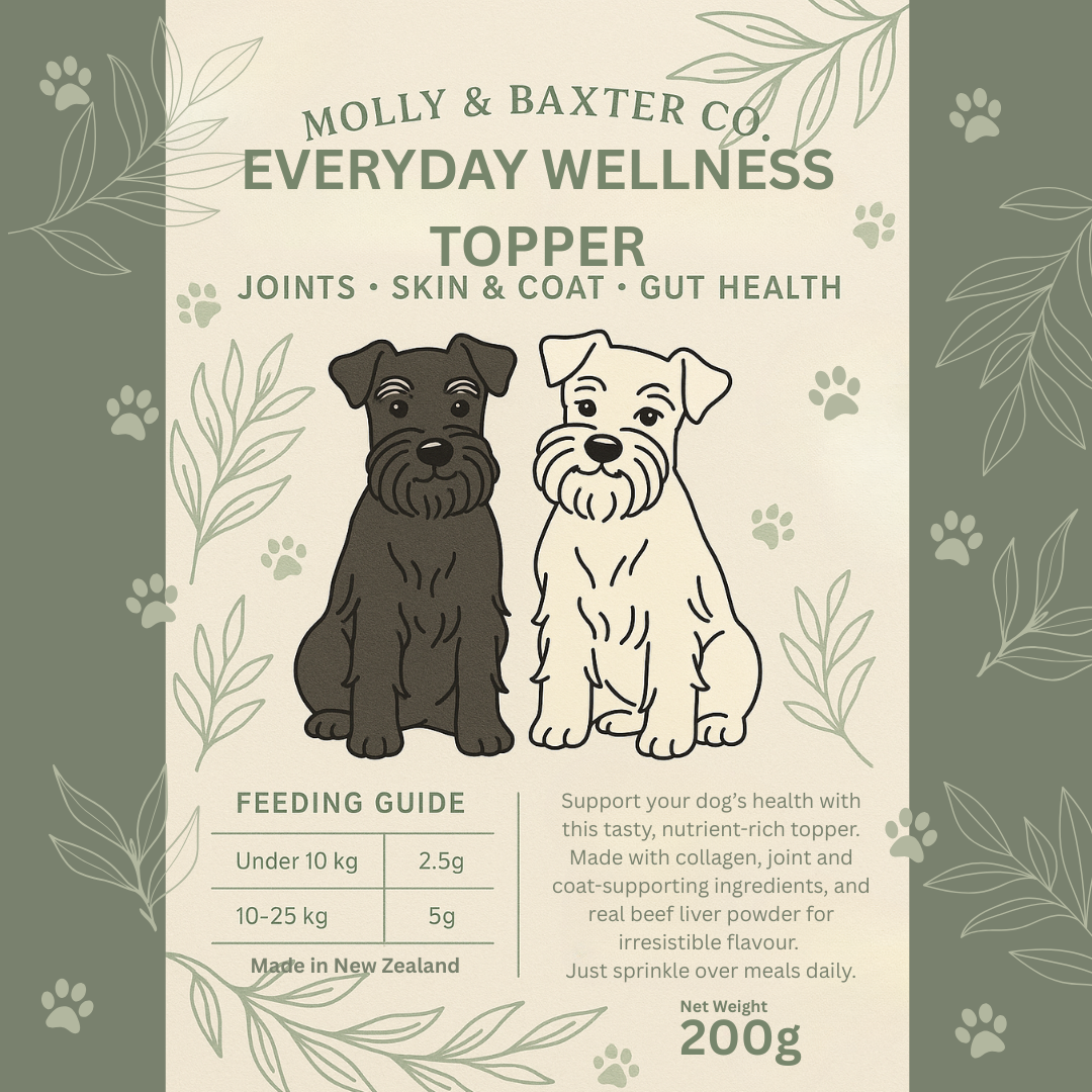 Give your pup a daily dose of goodness with our Everyday Wellness Topper – a carefully balanced blend of joint-loving, coat-boosting, digestion-friendly ingredients. Made in New Zealand with clean, functional ingredients (and a touch of beef liver powder for flavour), it’s the easy way to support your dog’s overall health – from the inside out.